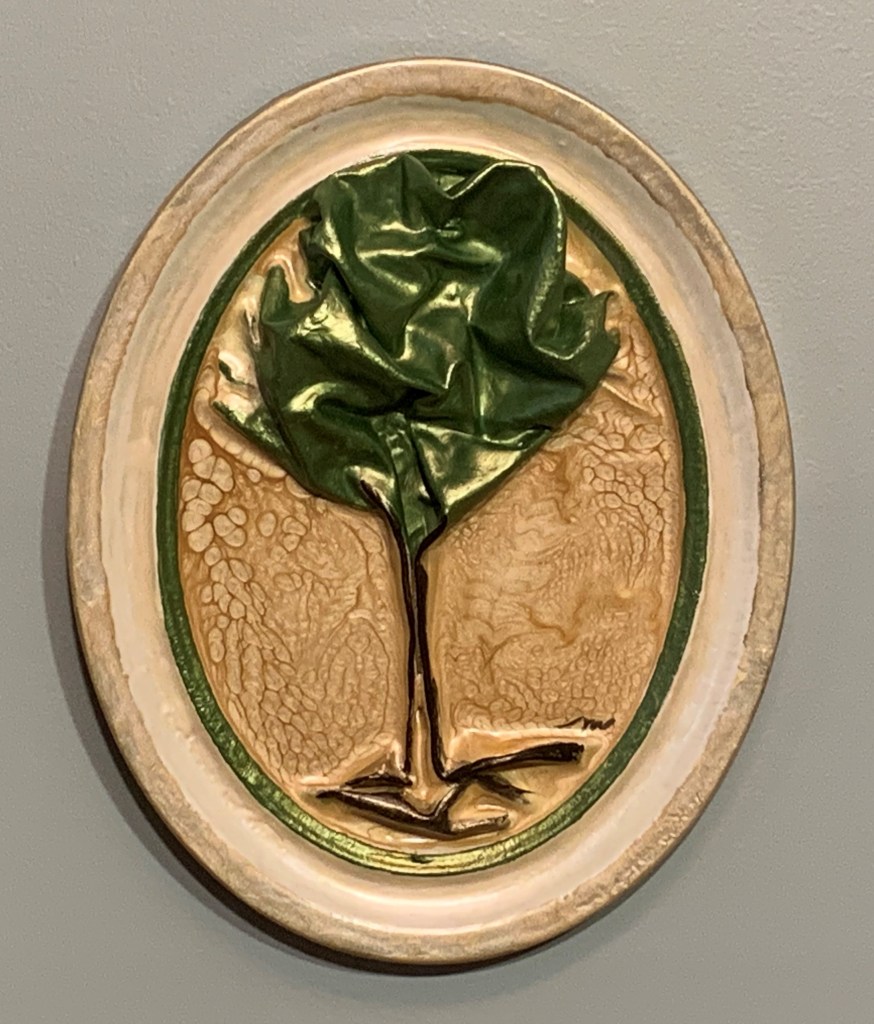 Cet arbre cache un ange aux ailes déployées. Il veille et ouvre les bras pour protéger, solide dans ses racines. Cette œuvre fait partie d’un duo.