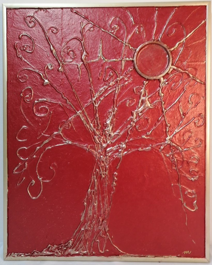 Un arbre rempli de couleurs borde un chemin. Ou est-ce un ruisseau? Qui sait puisque qu’il est représenté par le vide? L’arbre, symbole de soi, entame un virage vers un autre paysage. Et ce nouvel horizon sera-t-il teinté de ses vraies couleurs?