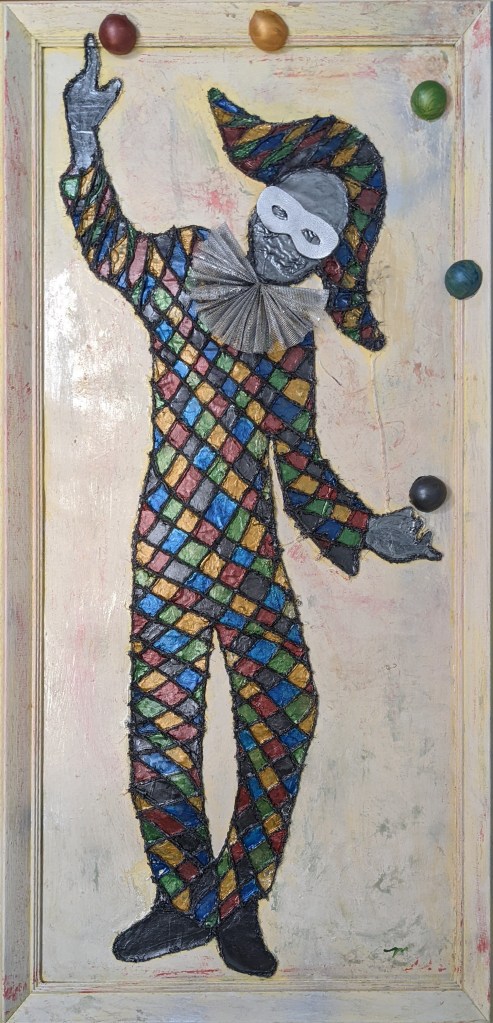 Je jongle avec les idées comme autant de balles qui tournent autour de ma tête, passant d’une couleur à l’autre sans être capable de m’arrêter, sans être capable de faire un choix. Dans cette grande mascarade qu’est la vie, on se cache derrière des masques, amuseur-public, pour épater la galerie dans un tourbillon de couleurs.