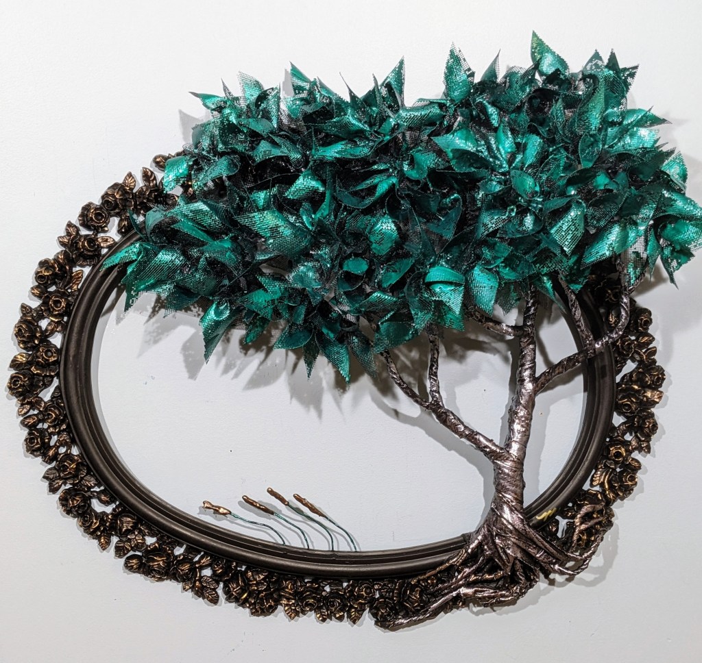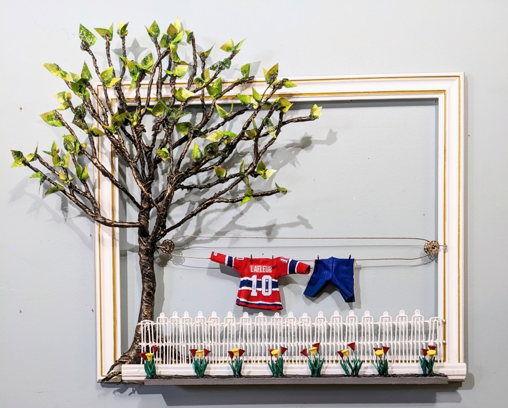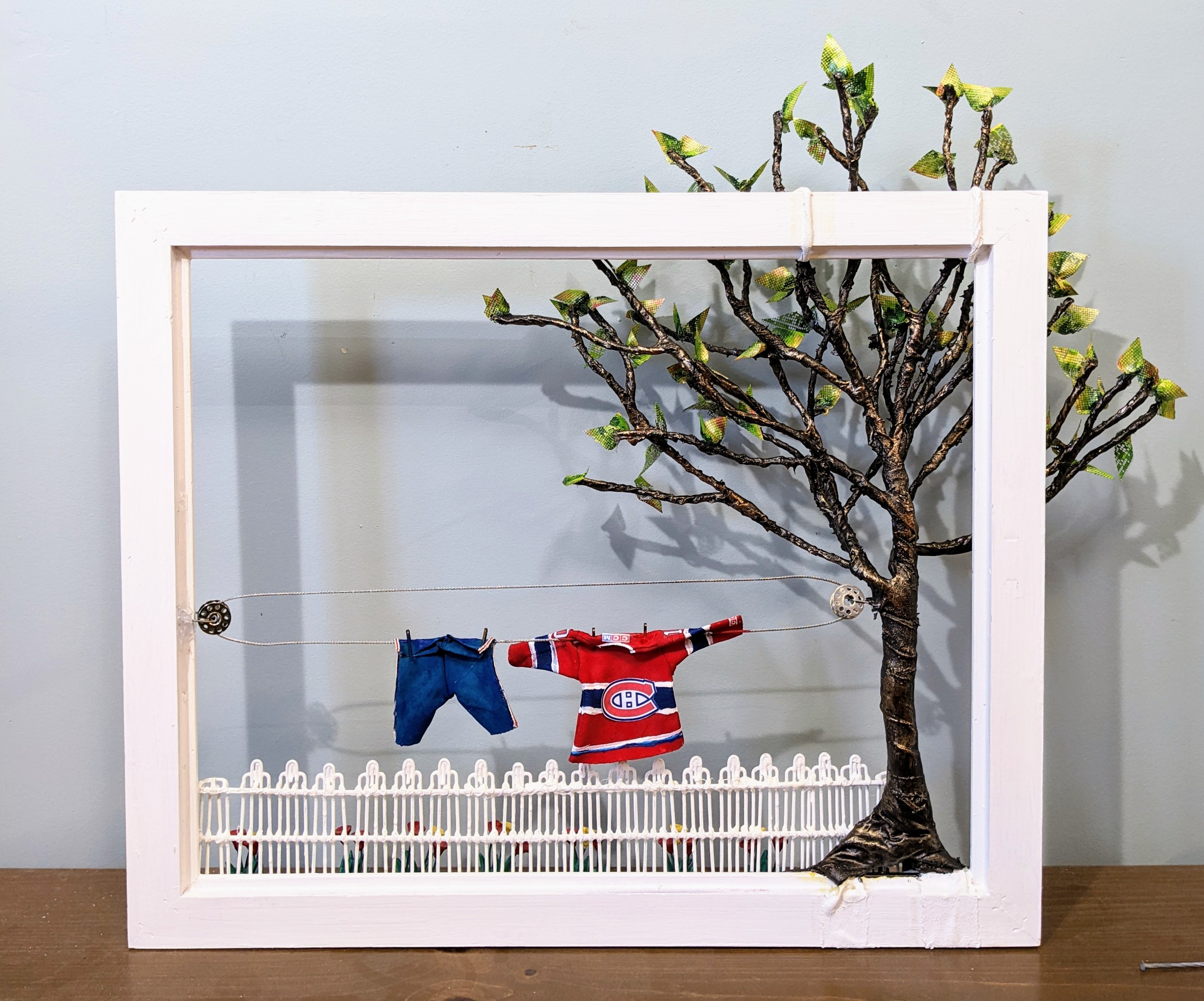 - Techniques mixtes, cadre de bois récupéré (coton, acrylique, dentelle, autres)