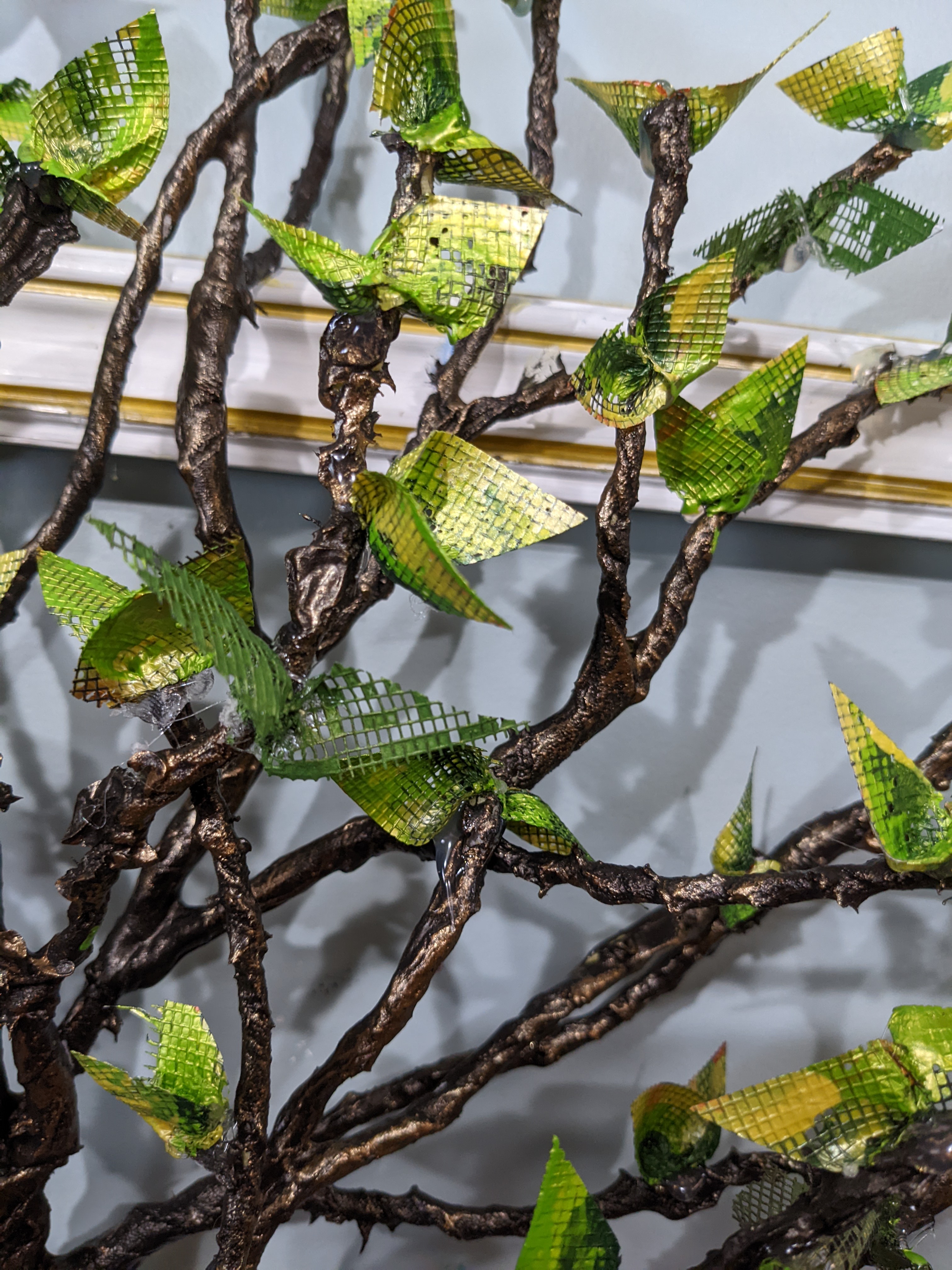- Techniques mixtes sur cadre récupéré (mdf, coton, moustiquaire, acrylique)