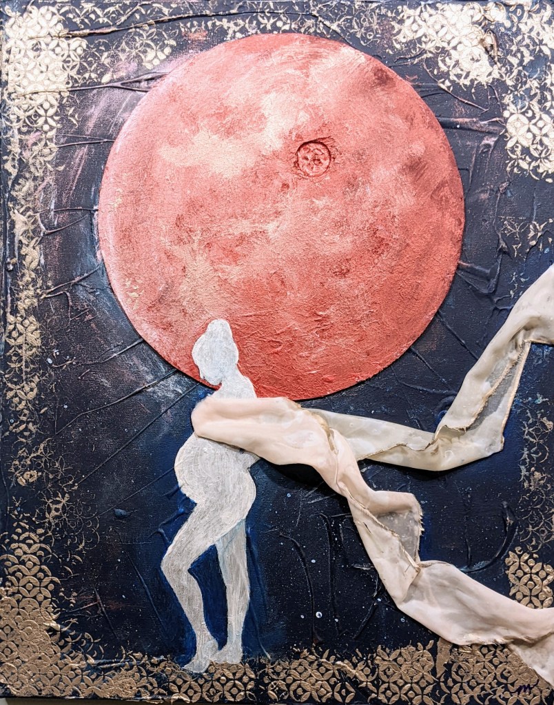Cette femme porte en son sein l’enfant à naître sous une lune de sang, symbole de succès, de protection, voire de délivrance.