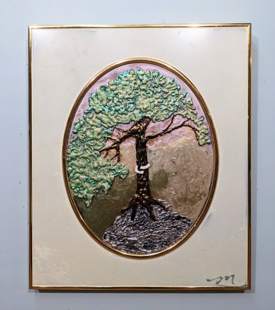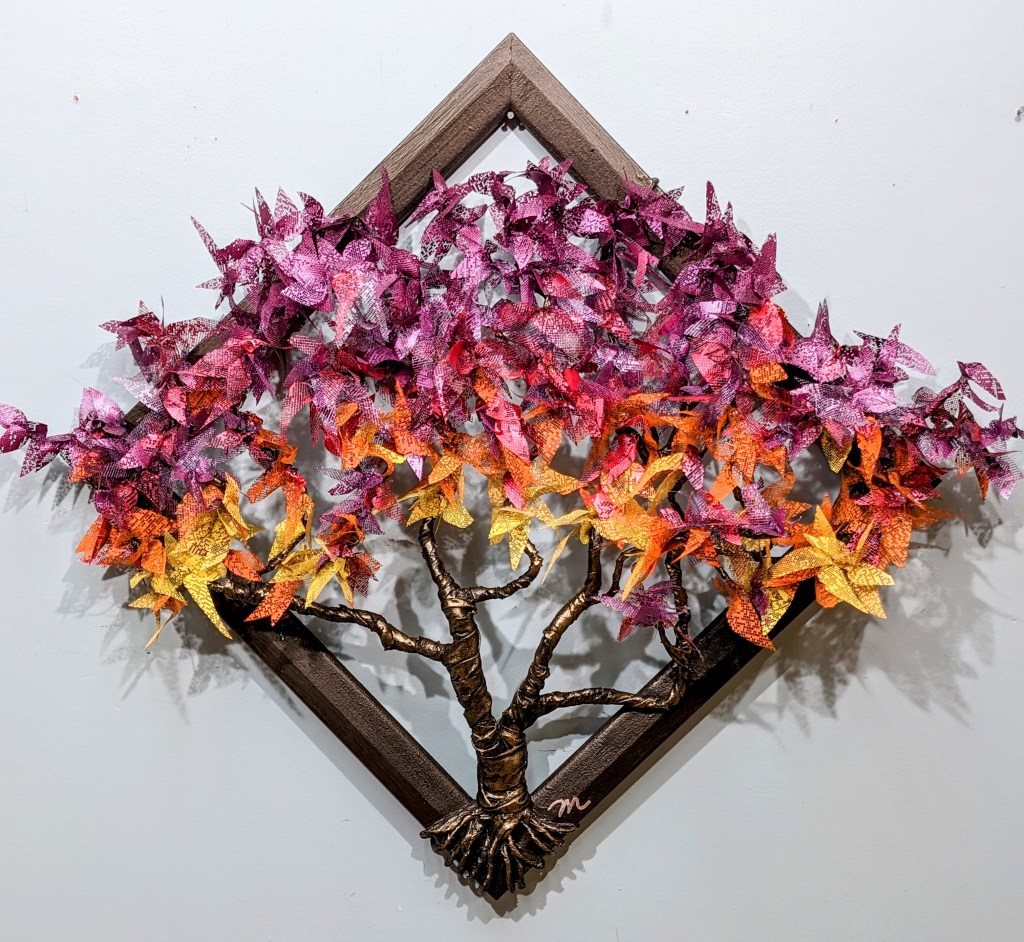 J’ai eu beaucoup de difficulté à trouver le bon titre pour cette œuvre parce que tous les mots semblaient trop fades pour la représenter. Mais, « Apothéose » traduit bien l’effervescence de couleurs et le feu d’artifice qui se dégage de cet arbre. Quand le bonheur pétille par l’intérieur, quand on devient éclosion de bonheur, c’est l’apothéose des sens!