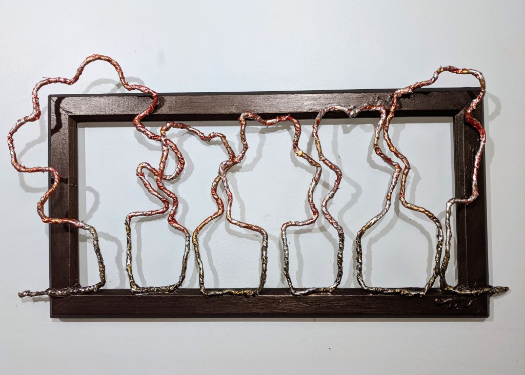 - Techniques mixtes sur cadre récupéré et imparfait, colle chaude et acrylique.