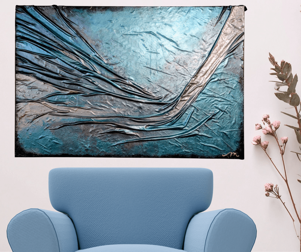 Œuvre abstraite évoquant la reconstruction intérieure et la force tranquille. Ses bleus et gris métallisés, avec reliefs et plis, symbolisent les cicatrices devenant lumière, transformant douleur en énergie créatrice.