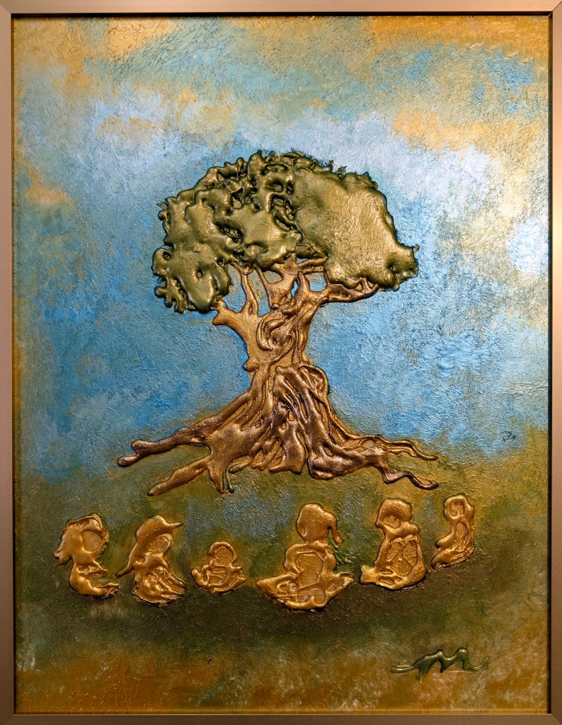 Dans cette œuvre, l’arbre porte en lui toute une histoire. Ses racines s’entrelacent comme des souvenirs, des valeurs, des récits que l’on raconte. Et à son pied, six enfants. Six fragments d’avenir façonnés par tout ceux qui ont été avant eux. Parce qu’un héritage, ce sont les liens que l’on tisse et tout ce qui continue de vivre.