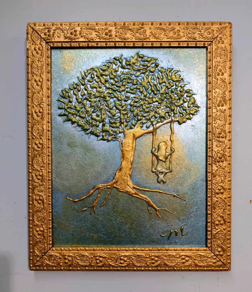 Un arbre qui semble flotter, presque léger… comme porté par l’air. Sous lui, une femme immobile, en pause. Elle ne se balance pas — elle habite l’instant. Protégée, enveloppée, elle est en lien avec l’arbre. Une communication silencieuse. Le feuillage, fait de gouttelettes de vie, laisse passer la lumière. Et doucement, le doré descend… glisse le long des cordes, jusqu’à entourer la femme d’un halo. Comme si l’arbre la nourrissait.