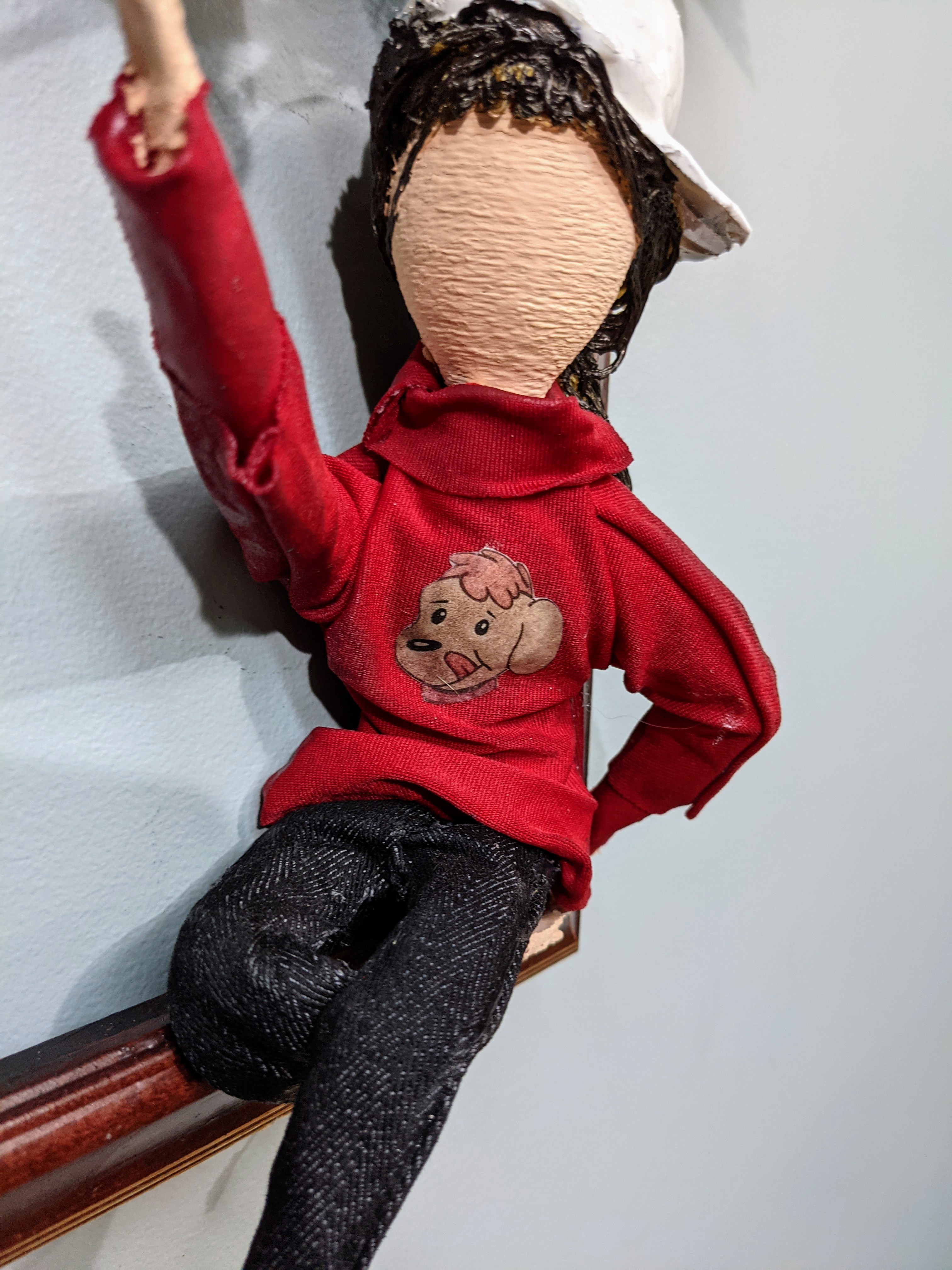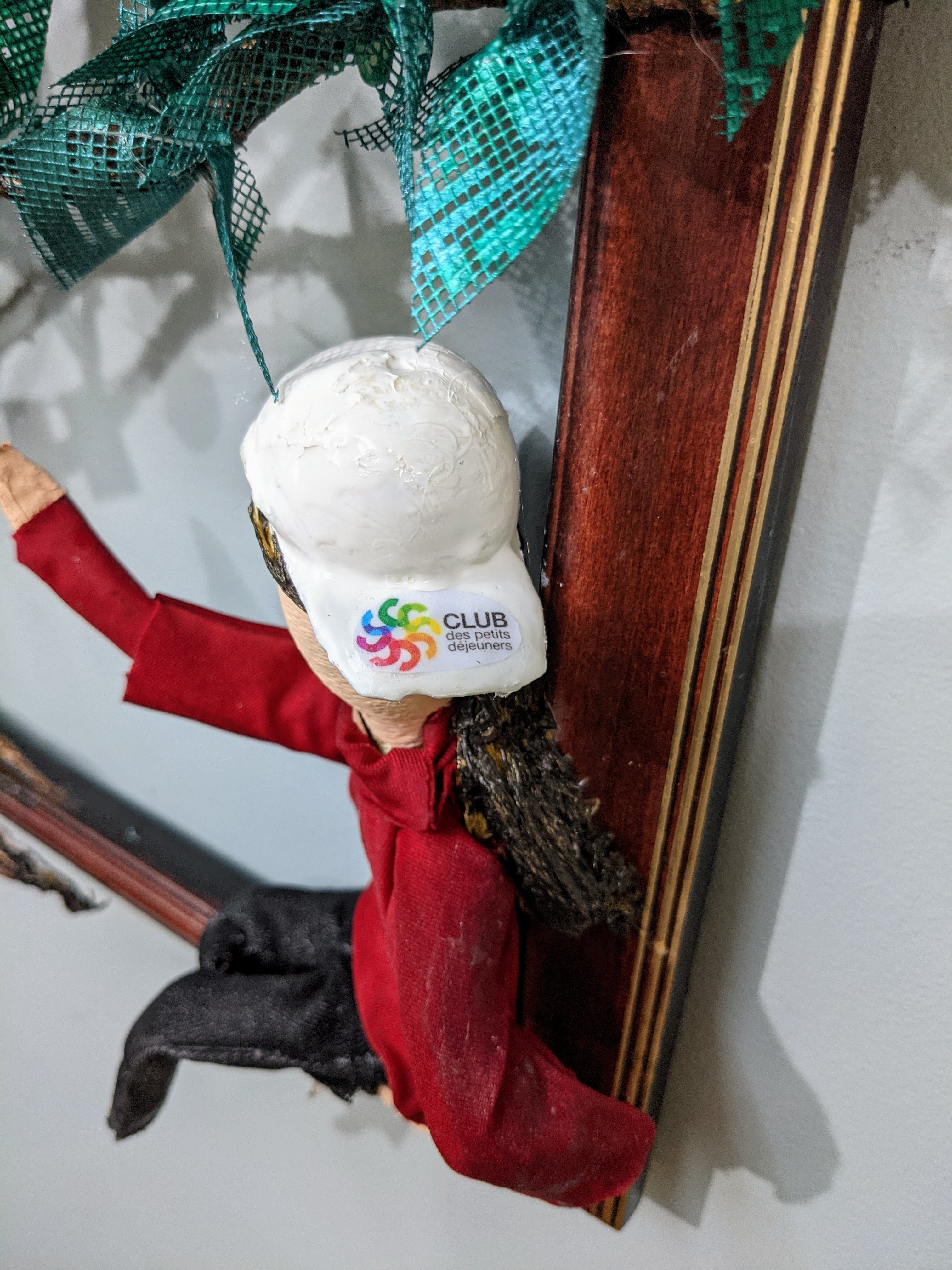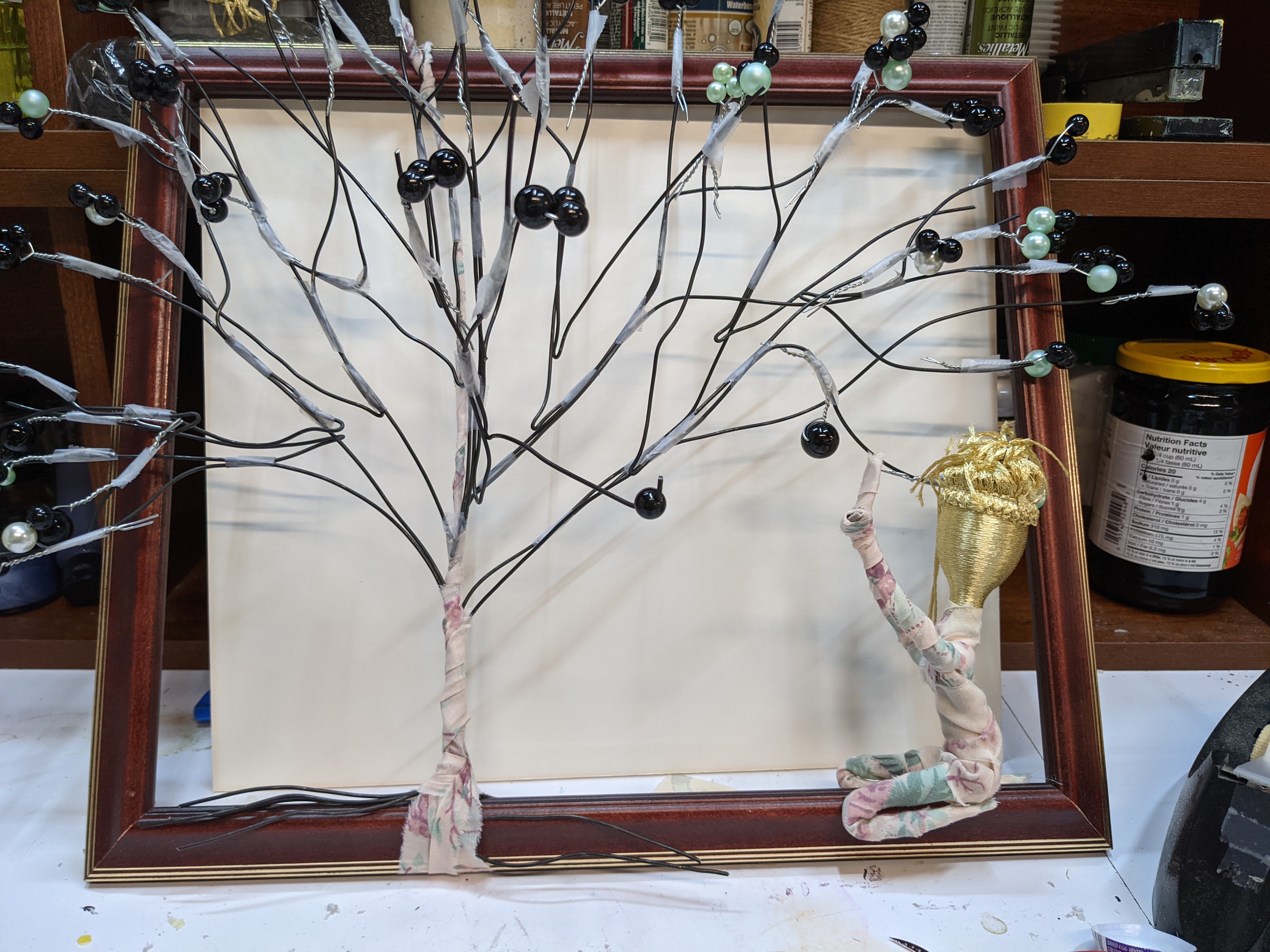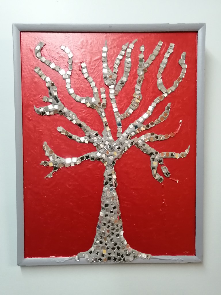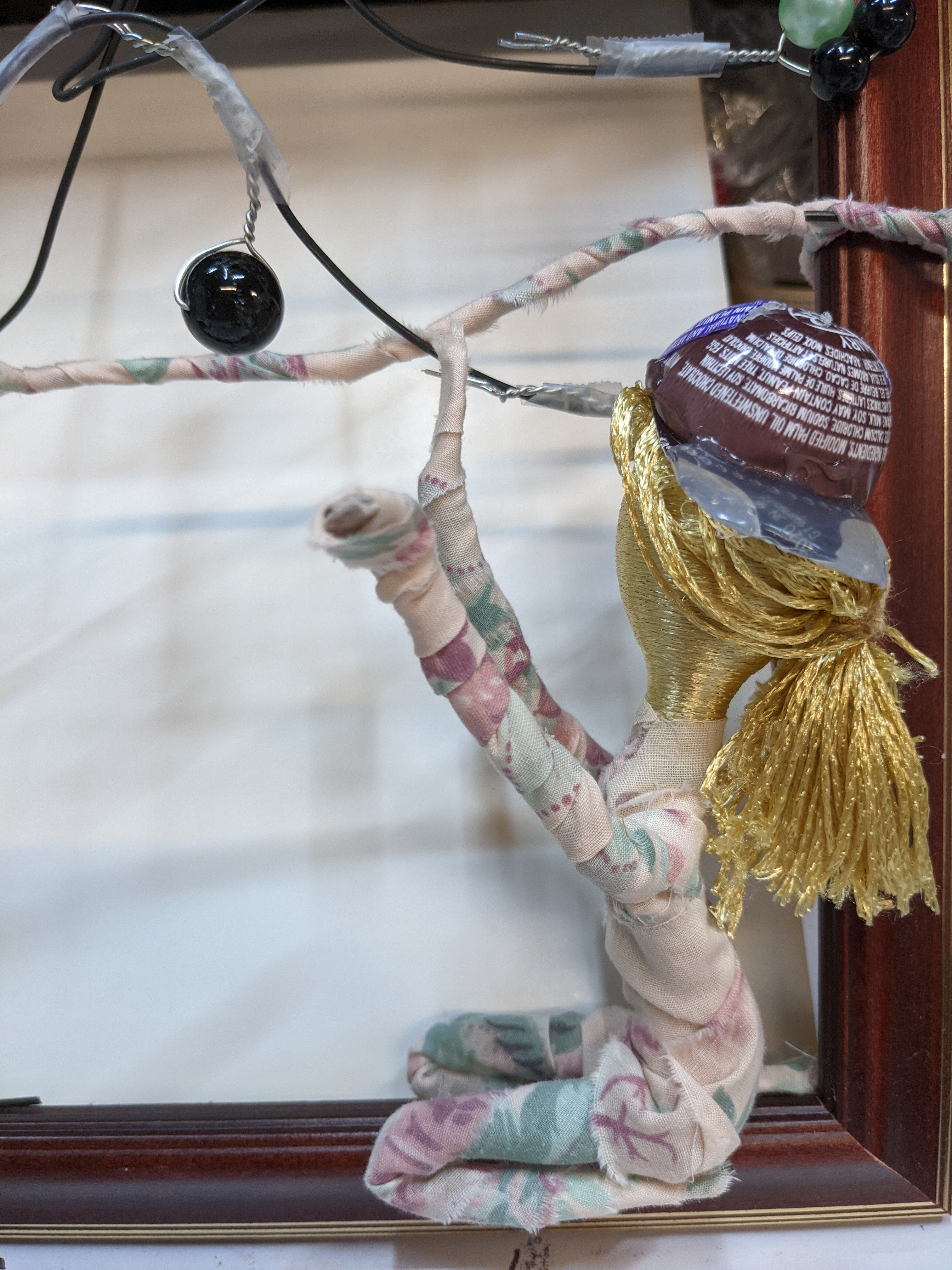 Bel exemple de récupération dans cette œuvre où un cadre forme un socle, une boule disco devient la Terre, du tissu s’enroule pour devenir un tronc et de la moustiquaire s’ébouriffe en feuillage.